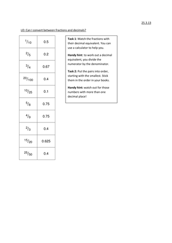 Editor's note with answer sheet and curriculum mapping A full blown lesson (or even 2 or 3!!) on converting between fractions, decimals and percentages. 0.45 \times 100 = 45\% To be able to convert common fractions, decimals and percentages. A worksheet with converting between fractions decimals and percentages, maybe best for a revision exercise or a with a group who has seen the work before, have a look, let me know what you think.